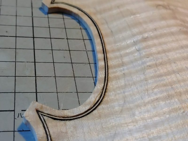 表板のパフリングを埋め込みました。初めてパフリング材の黒板にファイバ材を使ってみました。 C部の先端は何回やっても難しいです。