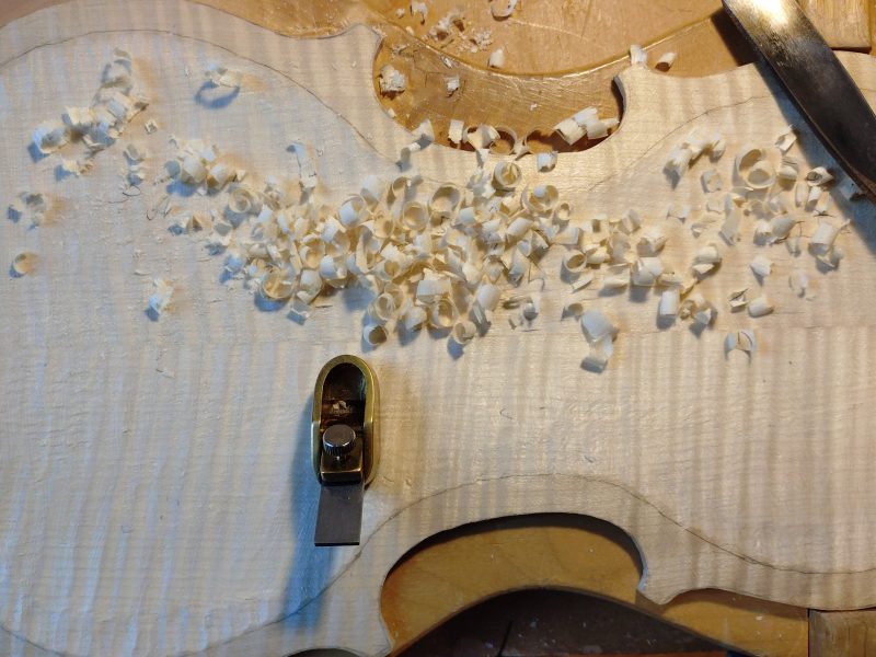 裏板のア ーチングを終えましたので、裏側を掘る厚み出しを始めました。 アーチングを終えた裏板。 (いつもどこで止めるか悩みます) 裏板の裏側を掘り始めました。