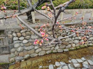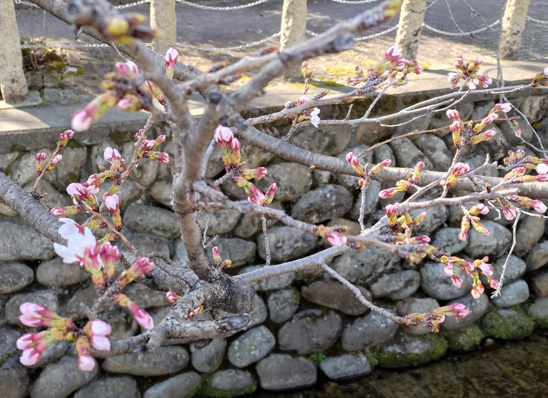 工房から20m位の所に膳所高校第2グランドに沿って桜並木があります。3輪以上咲いていますので開花?