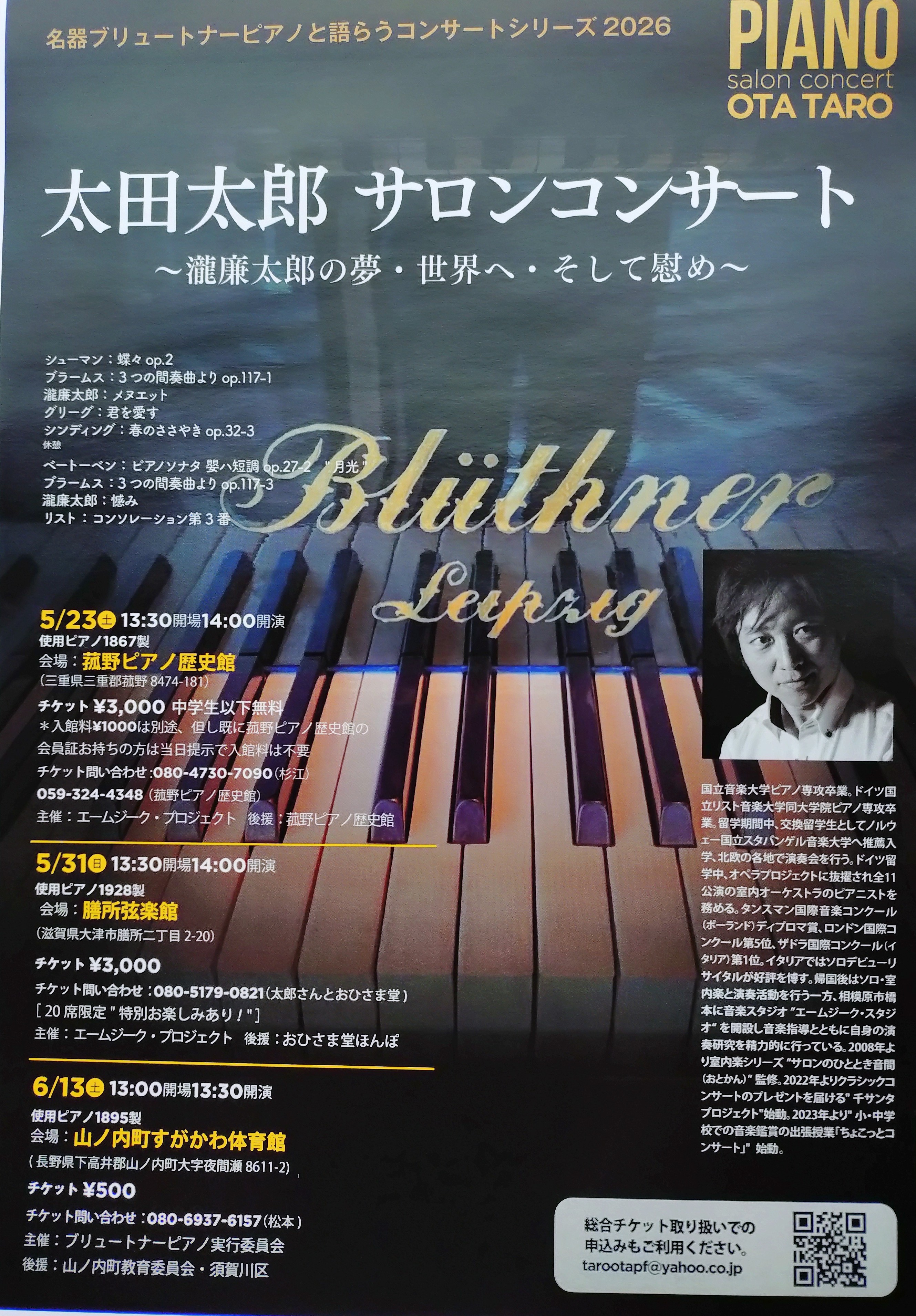 2026年5月31日 午後2時から「太田太郎 サロンコンサート」が開催されます。詳しくはチラシ参照下さい。