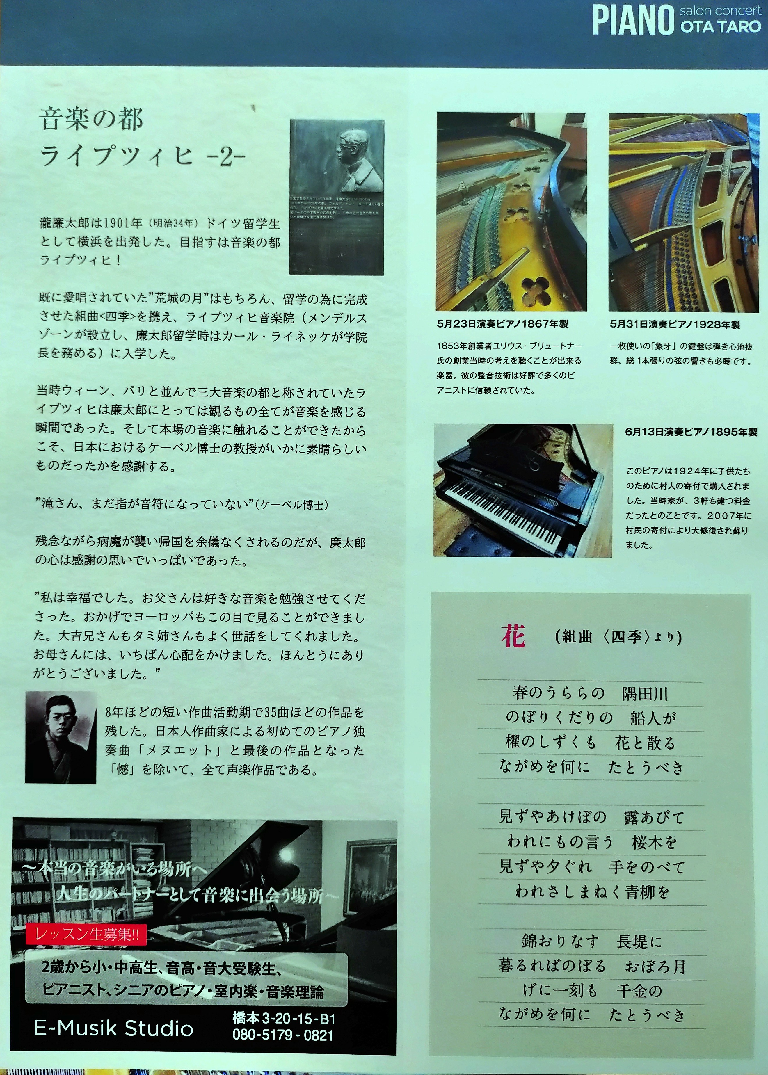 チラシの背景にあるピアノ鍵盤は、弊スタジオにある1928年製 ブリュートナの鍵盤です。(本文の紹介あり)